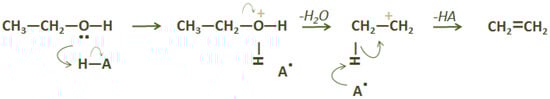 Bio-ethanol dehydration is an endothermic reaction, requiring relatively moderate temperatures (i.e., 180–500 °C) and the presence of a catalyst. The mechanism of bio-ethanol dehydration consists of the following steps: (a) protonation of the hydroxyl group by an acid catalyst, (b) deprotonation of the methyl group by the conjugate base of the catalyst, and (c) rearrangement to form C2H4 (Scheme 2) [30]. The selection of the most suitable catalyst for bio-ethanol dehydration into C2H4 is of key importance, in order to lower reaction temperature and overcome common issues, such as catalyst deactivation due to coke formation, particle collision, and agglomeration [29,30]. Acid catalysts, such as zeolites and silicoaluminophosphates (SAPO), have been widely used for this reaction, over the last decades, as they promote selective conversion into the desired product, with extremely high conversion and selectivity values, despite the fact that catalysts need to be frequently regenerated [30,34]. Actually, SAPO catalysts are significantly active in this reaction, reaching 98.0% selectivity to ethylene, at 250 °C, over SAPO-11-4 and 98.4%, at 340 °C, over Mn-SAPO-34 [35,36]. However, over modified HZSM-5 and MCM-41 catalysts, selectivity to C2H4 is even higher (i.e., 99.0%) [37]. Moreover, alumina-based catalysts, such as Al2O3-MgO/SiO2, exhibited high conversion and selectivity values (i.e., 99.0 and 97.0%, respectively) requiring regeneration over longer periods of operation [29]. Tungsten-based heteropolyacids, supported on various substances are highly selective at relatively low reaction temperatures (i.e., 180–250 °C) [38]. It has been proven that acid-base sites on the catalyst surface are linked with the product distribution of this reaction; ethanol dehydration most probably proceeds via the formation of intermediate species and highly depends on temperature, ethanol partial pressure, and the nature of acid-base sites [30,39,40,41,42,43]. In fact, as ethanol dehydration is an endothermic reaction, the reaction temperature strongly affects C2H4 yield. Basic catalysts, such as MgO or CaO have also been used with results that resembled those, over acidic catalysts. Phosphoric acid, oxides, molecular sieves, and other heteropoly acid catalysts can also be used for this purpose [29]. Syndol is a commercial catalyst, used by Halcon SD (USA), to obtain high ethanol conversion and selectivity to ethylene, at 400–500 °C [29,44,45,46]. Overall, a selection of the most promising catalysts for ethanol conversion into C2H4 are presented in Table 1.