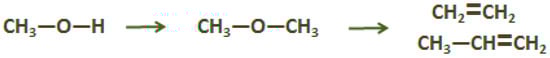 MTO is an autocatalytic reaction that conventionally takes place at moderate temperature (i.e., 300–450 °C), over acidic catalysts. A number of suggestions on the mechanism of MTO has been proposed, showing that most conclusions agree that the reaction network consists of at least three main pathways: (a) direct methanol conversion; (b) direct conversion of ethylene; and (c) ethane methylation by methanol [52]. Depending on the catalyst used, MTO can selectively yield mainly C2H4 and C3H6; most studies focus on methanol conversion into ethylene, as the main product. (Scheme 3) Over SAPO catalysts and zeolites, bio-methanol can be selectively converted into light olefins; over SAPO-34, selectivity to C2H4 and C3H6 is 60.0%, at 350–425 °C [57]. Modification on the catalyst synthesis procedure strongly affects product distribution. Dimethyl ether-to-olefins (DMTO) is a similar process that yields the same products. Bio-dimethyl ether can be produced from lignocellulosic biomass, via pyrolysis and gasification, resulting in the formation of olefins (i.e., C2H4 and C3H6) and syngas, following the bioliq® concept developed in Karlsruhe Institute of Technology, which is already implemented in a large scale unit in Germany [58,59,60]. DMTO can take place at high temperature (i.e., 723 °C) and low pressure (i.e., 4 bar), fully converting dimethyl ether (DME) into C2H4 (45.0%), C3H6 (39.0%), butenes (8.0%), and other light gases [10]. DME to olefins conversion is driven by a substantially complex reaction mechanism based on methylation, oligomerization, and hydrocarbon formation and cracking reactions, over zeolite catalysts [61].