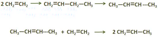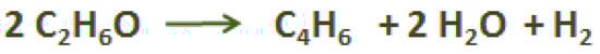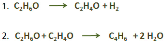C4H6 is also a by-product of C2H4 production through cracking of hydrocarbons. C4H6 production from bio-ethanol is a promising alternative that has been industrially implemented prior to the installation of naphtha cracking technologies; ethanol to C4H6 processes have been used since 1920, constituting the main production practice until the end of World War II [22,100]. Main routes of this process include dehydrogenation, dehydration, and condensation over suitable catalysts, either in one-step (i.e., Lebedev approach) (Scheme 5) or two-step processes (i.e., Ostromisslenski approach) (Scheme 6) [100]. In the first case, multifunctional catalysts have been employed, mainly alumina and magnesia-silica catalysts, via C2H4 dimerization and subsequent metathesis, while at the latter, ethanol was initially dehydrogenated into acetaldehyde, over copper-based catalysts, at moderate temperatures, and then ethanol reacted with acetaldehyde to form C4H6, over Ta2O5 catalyst, as well as other oxides, supported on silica [101,102]. Several research projects suggest that aldol condensation of acetaldehyde is a key step in ethanol conversion into C4H6 [103]. On the other hand, latest works, including DRIFTS (Diffuse Reflection Infrared Spectroscopy) analyses and DFT (Density Functional Theory) calculations, propose that ethanol carbanionic intermediates are of key importance for the reaction mechanism [104].