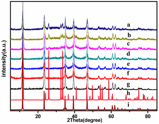 Powder XRD patterns of (a) Pt–9Bi/HT, (b) Pt–7Bi/HT, (c) Pt–5Bi/HT, (d) Pt–3Bi/HT, (e) Pt–1Bi/HT, (f) Pt/HT, (g) HT, (h) BiOCl, (i) Mg4Al2(OH)12CO3·3H2O. HT: hydrotalcite.