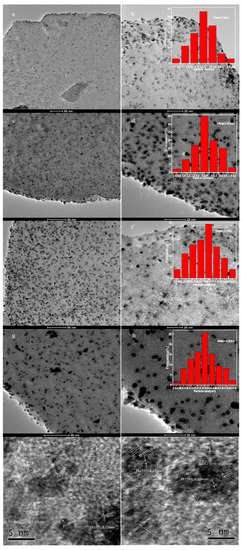 High-resolution TEM (HR-TEM) images and particle size distribution histograms for representative catalysts: (a,b) Pt/HT, (c,d) Pt–3Bi/HT, (e,f,i,j) Pt–7Bi/HT, and (g,h) Pt–9Bi/HT.