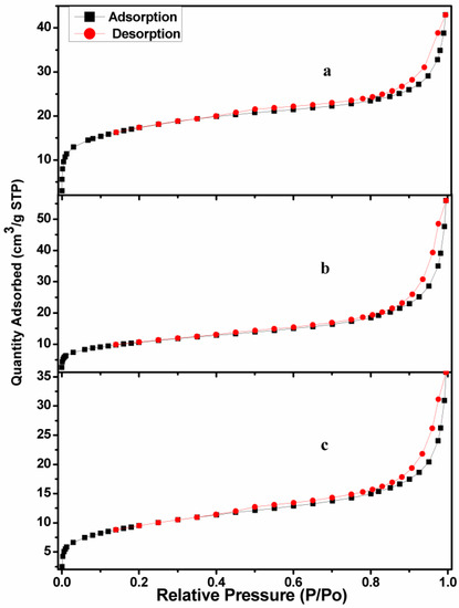 N2 adsorption–desorption isotherms at 77 K for representative catalysts (a) HT, (b) 5%Pt–0%Bi/HT, (c) 5%Pt–7%Bi/HT.