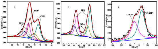 XPS analysis was employed to study the chemical state and composition of Pt–Bi/HT catalysts. Figure 4 shows the deconvoluted Pt (4f), Bi (4f), and Cl (2p) XPS spectra for the representative Pt–7Bi/HT catalyst. The Pt 4f signal can be deconvoluted into two pairs of doublets and the XP lines arising from the Al 2p core level at 73.6–74.3 eV overlapped with those of the Pt. The most intensive doublet with binding energies of 70.8 (Pt 4f7/2) and 74.25 eV (Pt 4f5/2) is attributed to metallic Pt (0) [30]. The peaks located at 72.12 and 75.57 eV are assigned to Pt4f7/2 and Pt4f5/2, respectively, which is characteristic of the Pt (2+) ions of PtO in the achieved catalyst [31]. Based on the XPS analysis, the proportion of various chemical states for the detected Pt species could be concluded, consisting of 65.8% Pt (0) and 34.2% Pt (2+).