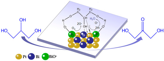 Although much work has shown that high selectivity can be achieved on Pt–Bi supported catalysts for the selective oxidation of alcohols, the origin of the promoting role of Bi on Pt-based catalysts still remains unclear. In the case of Pt–Bi-based catalysts used for the selective oxidation of glycerol towards DHA, three chemical states of Bi including Bi (0), Bi2O3, Bi2O2CO3 and BiO(OH) [17,18,19,20] are often found. Various interpretations for the role of promoters, such as the geometric blocking effect of active sites [17,20,33] and the formation of a complex among Pt, Bi, and substrate [34], have been proposed. In this work, the Bi species on the Pt–Bi/ HT catalysts were observed in the form of Bi metal and BiOCl due to the slightly different preparation procedure, in which Bi loading was carried out in the absence of hydrochloric acid with BiCl3 as precursor of Bi, showing that the catalyst preparation methods have an important effect on the composition and structure of catalysts and their catalytic performance [35]. Based on the previous mechanism and catalytic reaction results, a plausible model is proposed as shown in Figure 6 to elucidate the promoting role of Bi species on the Pt/HT catalyst in the selective oxidation of glycerol towards DHA. The promotional role of Bi species is dominated by the geometrical effect and the formation of strong hydrogen bonds between BiOCl on the surface of support and glycerol. The two terminal hydroxyl groups were bound on the surface of the Pt–Bi nanoparticles by the formation of a hydrogen bond between the Cl ion of BiOCl and the H of the primary –OH group of the glycerol molecule, and the bismuth adatoms’ function as site blocker on the surface of the Pt metal to control glycerol orientation towards the oxidation of the secondary –OH group. The weak electronic interaction between Pt and Bi could improve the catalytic activity through activating oxygen [36]; however, the hydrogen bond role between the BiOCl and glycerol could also work to some extent in the Pt–Bi/HT system.