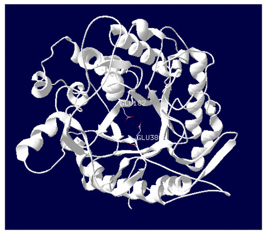 The bgl gene was cloned into a pYLSC1 vector using SfiI and XbaI restriction sites as described in Section 4, theoretically placing the bgl coding sequence in frame. The transformant (pYLSC1-bgl) that displayed the highest and most stable β-glucosidase activity was selected for further experiments. Alignment of the bgl coding sequence with entries in the NCBI database resulted in a 99.65% identity with the gene sequence of T. fusca YX (NCBI accession number Q47RE2). A mismatch in the amino acid sequences of Q47RE2 and bgl occurred only at the 137th amino acid, where bgl has an arginine instead of a histidine. Molecular modeling of β-glucosidase deduced from the bgl gene is shown in Figure 1. Two glutamic acids, including Glu 182 and Glu 388, were present in the predicted active center of the β-glucosidase, and the 137th amino acid was not the active site. Therefore, we assume that the variation at 137th amino acid has no specific means.