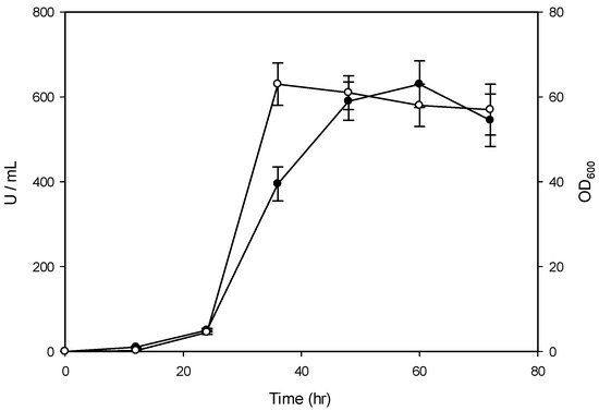 Figure 2 shows that the transformant (pYLSC1-bgl) logarithmically grew at 28 °C from 24 to 36 h and then moved toward a stationary phase. The OD600 value was 62 after 36 h of incubation. Extracellular β-glucosidase rapidly accumulated along with the increase in OD600 value. The maximum activity (630 U/mL) in the culture filtrate was observed after 60 h of incubation. Little β-glucosidase activity was detected in the control strain, Y. lipolytica (pYLSC1), under the same conditions (data not shown).