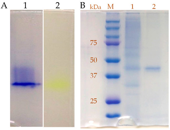 Polyacrylamde gel electrophoresis of the β-glucosidase purified from T. fusca NTU22. (A) Native polyacrylamide gel electrophoresis (PAGE) of the purified enzyme. Lane 1: Protein stained by Coomassie Brilliant Blue R-250. Lane 2: Activity stained by p-nitrophenyl-β-glucopyranoside. (B) SDS-PAGE. Lane M: Protein molecular mass standard; Lane 1: Crude culture filtrate; Lane 2: Purified β-glucosidase. Electrophoresis conditions: 150 V, 1 h.