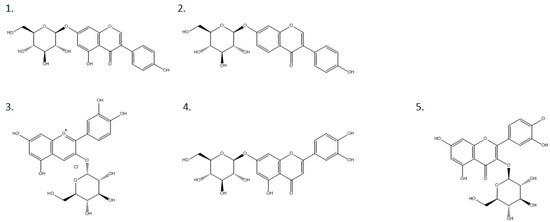 Chemical structures of the flavonoids. 1, Genistin; 2, Daidzin; 3, Cyanidin 3-O-glucoside chloride; 4, Luteolin 7-glucoside; 5, Quercetin 3-β-glucoside.