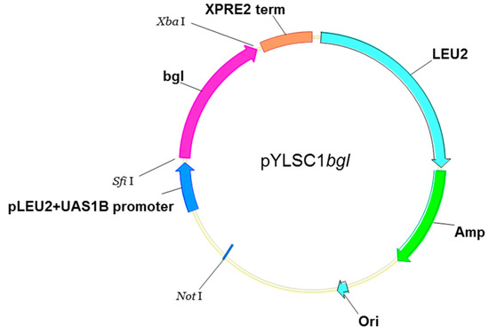 The β-glucosidase gene was amplified from the chromosomal DNA of T. fusca NTU22 by PCR using the primers 5′-T TTG GCC GTT CTG GCC ATG GTG ACC TCG CAA TCG ACG AC-3′ (SfiI site is underlined) and 5′-TTT CTA GAG TCA TTC CTG TCC GAA GAT TCC ACC GTT GCG CA-3′ (XbaI site is underlined) according to the gene sequence of T. fusca YX (NCBI accession number Q47RE2). The PCR-amplified fragment was digested with SfiI and XbaI, and then ligated with SfiI-XbaI-treated pYLSC1 to generate the expression plasmid pYLSC1-bgl (Figure 6) for the production of protein in Y. lipolytica P01g.