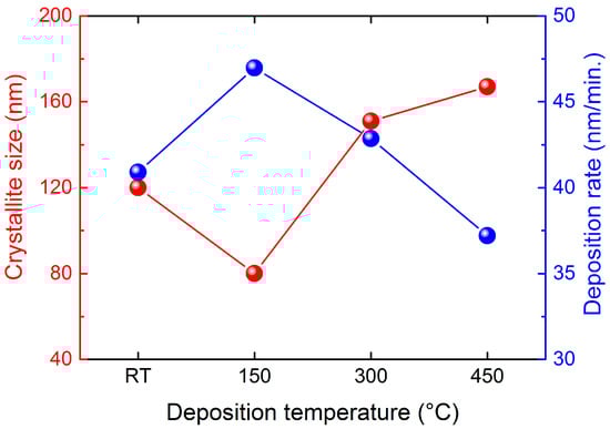 Crystallite size and deposition rate as a function of deposition temperature for the direct current magnetron sputtered Ti films. Deposition rate shows a volcano shape dependence on temperature, while crystallite size has an opposite trend. RT: room temperature.