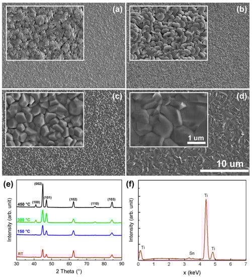 Scanning electron microscope (SEM) images of titanium samples deposited without substrate heating at (a) RT, (b) 150 °C, (c) 300 °C and (d) 450 °C. (e) X-ray diffraction (XRD) spectra of all deposited Ti films; (f) energy dispersive X-ray spectroscopy spectrum of titanium film deposited at 150 °C on fluorine-doped tin oxide (FTO) substrate.