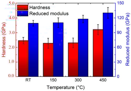 Analysis of nanoindentation data (Figure 3) evidenced significant differences in mechanical properties between the deposited Ti films. Substrate heating led to an increase in reduced modulus from 109 GPa for RT sample (and similar values observed for 150 and 300 °C) to 130 GPa for the film deposited at 450 °C. Similarly, hardness values are almost the same regardless of the deposition temperature up to 300 °C (~3.75 GPa), while a small increase can be observed for the film deposited at 450 °C. Nanoindentation hardness of the films is only slightly higher in comparison to the coarse grained Ti bulk sheet (~2 GPa) measured at the same experimental setup, especially for the films deposited up to 300 °C. This fact correlates well with the fine-grained structure, where dislocation activity for crystallite with size around 100 nm is suppressed as explained by the well know Hall–Petch effect [36]. Nevertheless, the relative proximity of hardness values of the Ti films and pure Ti metal bulk reflects the high purity of the films, since oxygen or nitrogen impurities strongly affect the mechanical properties and increase both the hardness and elastic modulus values [32]. No traces of oxygen were detected using EDS. Hardness increase up to 4 GPa was reported for Ti sputtered films under similar conditions but under Ar/O2 gas mixture [18]. It should be noted that either oxides (TiO2) or nitrides (TiNx) can reach much higher hardness. In case of magnetron sputtered TiO2 films hardness values of pure anatase is in the range of 6–11 GPa, whereas rutile can reach around 20 GPa [37].