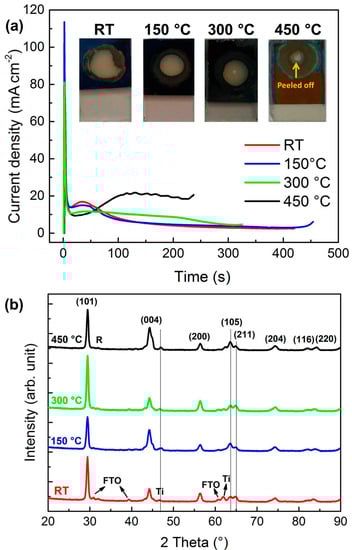 Figure 5a shows the current density plot in time during the anodic oxidation of the sputtered Ti layers sputtered on FTO glass at different temperatures (RT, 150, 300 and 450 °C). All the current transient curves can be divided into three typical stages, already described in detail elsewhere [16,38]. Briefly, the very sharp current density peak observed during the first seconds of the anodization process is associated with the formation of an initial compact TiO2 layer. A relatively steady state region followed, denoting the self-organizing electrochemical reaction underlying the formation of TiO2 nanotubes. Finally, a sudden increase of current density marks the end point of the reaction, which may be accompanied with the creation of random cracks within the TNT and/or their partial delamination [39].