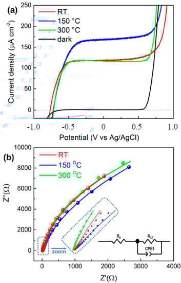 Linear sweep voltammetry curves of the TiO2 nanotubes (a). Nyquist plots for TNT-RT, TNT-150, and TNT-300 measured at an applied bias potential of 0 V vs. Ag/AgCl under illumination of AM1.5G with the intensity of 100 mW cm−2 (b). Symbols are experimentally measured impedance data; solid curves are fitted to the equivalent circuit shown (inset). Rs is solution resistance, RCT is charge transfer resistance, Constant phase element (CPE1) is capacitance element. Photoelectrochemical (PEC) measurements were carried out in 1 M NaOH electrolyte under simulated solar light irradiation (air mass-AM1.5G, 100 mW/cm2).