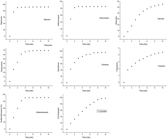 The CPO–chitosan macrospheres were then assayed for adsorption and oxidation of the PhCs, as shown in Table 2. For the heterogeneous catalysis process, the adsorption process was important for the subsequent oxidation, so it was desirable to measure and quantify the adsorption of the PhCs on the macrospheres. Up to 31% adsorption was observed for sulfamethoxazole, while practically no naproxen or ketorolac adsorption was observed. In general, little adsorption of the PhCs on the chitosan matrix was observed. The immobilized enzyme maintained the capacity to oxidize the PhCs with high conversion (up to 92% for ketorolac), except for trazadone (12%) (Table 2). The total removal of the PhCs, i.e., the sum of the adsorption and oxidation, reached values greater than 80% for all PhCs except trazadone.