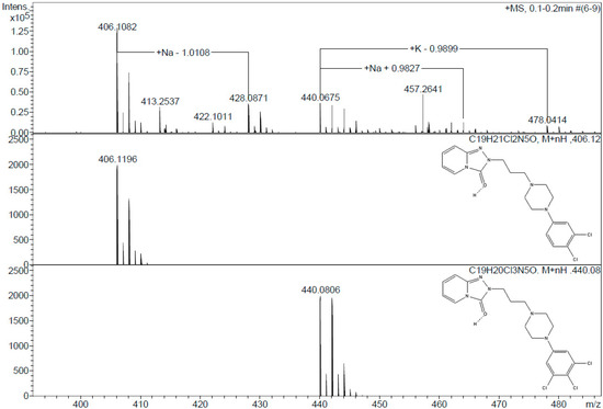 To elucidate the degradation mechanism and evaluate the environmental safety of the enzymatic transformation, it is necessary to analyze the intermediate and final products generated in the degradation reaction. The versatile catalytic activity of CPO makes the production of a broad array of reaction products from PhCs possible. However, under the conditions employed in our study, only halogenation, hydroxylation, and decarboxylation activities were observed. Table S2 lists the molecular weights of the enzymatic oxidation products. According to these results, most of the PhCs were oxidized by the addition of one or even two chlorines to the molecule. No reaction was detected under peroxidase activity conditions (pH 5.0–6.0, and/or in the absence of chlorine ions) for any of the PhCs tested. Some of the reaction products have been previously reported [41,42,43]. However, two PhCs showed unique behavior under our tested conditions. Based on the ESI(+) mass spectrometry of the naproxen products, two main compounds were identified in the degradation process. In the first stage of the degradative CPO-catalyzed oxidation, naproxen was hydroxylated at the o- and m-positions. However, this product was not observed in the MS analysis. The observation of a molecular ion [M + H]+ at m/z 261.1231 suggested that this compound was further converted to the corresponding 1,4-naphthoquinone derivative (C14H13O5, m/ztheo 261.0763). Another degradation route could also be proposed based on the observation of another peak at m/z 217.0865. In this case, a decarboxylation step after hydroxylation in the CPO-catalyzed conversion could be achieved (Figure 2). In contrast, in the degradation of trazadone, the detected species suggested the sequential addition of chlorine at the o and m-positions. Two main ions with chlorine-specific isotopic characteristics were detected in the ESI(+) mass spectra (Figure 3). The first ion, detected at m/z 406.1082, was attributed to the addition of one chlorine at the o-position. The isotopic pattern was characteristic of the presence of two chlorine atoms, and a molecular formula of C19H21Cl2N5O (m/z 406.1196) can be corroborated. A second ion at m/z 440.0675 was assigned to the addition of two chlorine atoms. The isotopic pattern and the molecular weight confirmed the presence of a compound with a molecular formula of C19H20Cl3N5O (m/z 440.0806). No oxidation products were detected for diclofenac under these assay conditions during the ESI-MS analysis; oxidized products from the literature are described in Table S2 [41]. Estradiol was analyzed using ESI and GC-MS techniques. Halogenated products were detected only by GC-MS analysis following the procedure described in the Materials and Methods section [43]. Finally, the halogenated products of sulfamethoxazole were different from those previously reported. According to Zhang et al., sulfamethoxazole first undergoes halogenation, followed by ring opening [42]. In this work, only fragments were observed after the reaction: one product with a molecular formula of C10H11ClN3O3S (m/z 288.0254) and another one with a formula of C4H5NO3 (m/z 145.00), probably as a result of more extensive oxidation due to the concentration of activating salts.