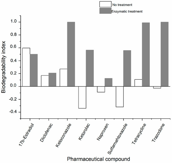 The enzymatic oxidation of trazadone, tetracycline, and ketoconazole produced readily biodegradable products, as reflected by their high biodegradability indexes.