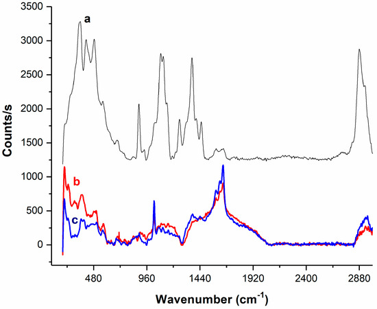 Raman spectra of the chitosan powder (a); the chitosan macrospheres (b); and the enzyme-chitosan macrospheres (c).