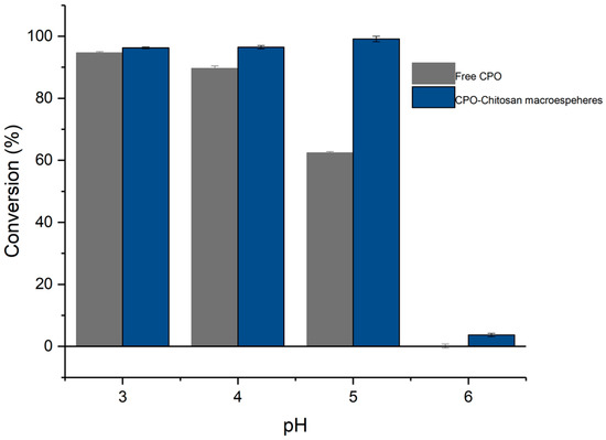 Profile of activity versus pH for free CPO and the CPO–chitosan macrospheres during the oxidation of ketorolac.
