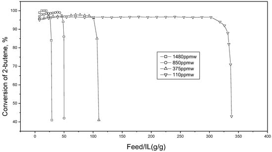 In Figure 1, a marked increase of the mass of the feedstock treated with 1 g ionic liquid with the decrease of water content in the feedstock can be seen. When the content of water in the feedstock decreased from 1480 ppmw to 110 ppmw, the mass of feedstock treated with 1 g ionic liquid increased from 29 g to 338 g before deactivation of the ionic liquid (deactivation was considered when the conversion of 2-butene was lower than 50%). It can also be seen that, in the steady period, the higher water content in the feedstock led to higher conversion of 2-butene. This observation indicated that the activity of the chloroaluminate ionic liquid in the high water content system was stronger than that in the low water content system.