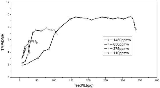 In Figure 3, the effects of water content in feedstocks on TMP/DMH in alkylates are reported. As with the isooctane content in Figure 2, a similar trend of TMP/DMH in alkylates is observed. As the amount of the feedstocks treated increased, the ratio of TMP/DMH first increased and then remained stable. Finally, the ratio decreased with the deactivation of the ionic liquid.