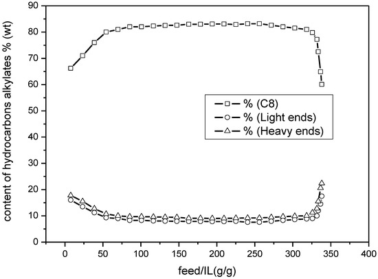 In summary, it was found that water, methanol and diethyl ether in the feedstock affected the catalytic performances of the ionic liquid such as lifetime, isooctane selectivity, and ratio of TMP/DMH. Low water content in the feedstocks led to a relatively high lifetime isooctane selectivity, ratio of TMP/DMH and low catalytic activity. Addition of methanol and diethyl ether decreased the lifetime of the ionic liquid. Besides, the addition of methanol improved the isooctane selectivity and ratio of TMP/DMH in the alkylates.