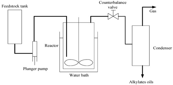 In all experiments, the alkylation reactions were carried out in a 500 mL stirred pressure reactor (Jiayi Chemical Machinery Company, Weihai, China) shown as part of Figure 12 and 42.6 g (about 30 mL) modified ionic liquid was charged into the reactor and brought to the proper temperature before experimenting. The feed continuously passed through the stirred ionic liquid layer with a plunger pump according to a rate of 500 mL per hour until the deactivation of the ionic liquid. The counterbalance valve was kept at a certain pressure to ensure a liquid reaction. The effluent from the reactor was separated into gas and liquid products by a condenser of ice water. In all experiments, the molar ratio of isobutane to 2-butene was 11:1 and the rate of agitation was 800 rpm. The reaction temperature was controlled by a thermostatic water bath with temperature controller.