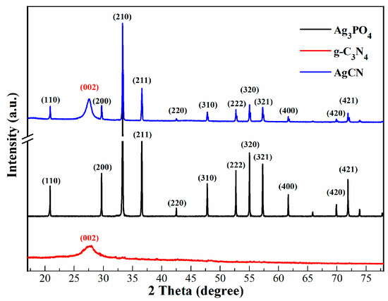 The phase structures of the as-prepared g-C3N4, Ag3PO4, and AgCN composite were analyzed by XRD instrument and the results are shown in Figure 1.