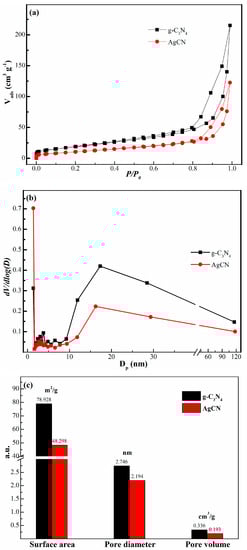 Nitrogen gas adsorption–desorption isotherms (a); BJH pore-size distribution curves (b); and (c) SBET of the g-C3N4 and AgCN composite photocatalysts.