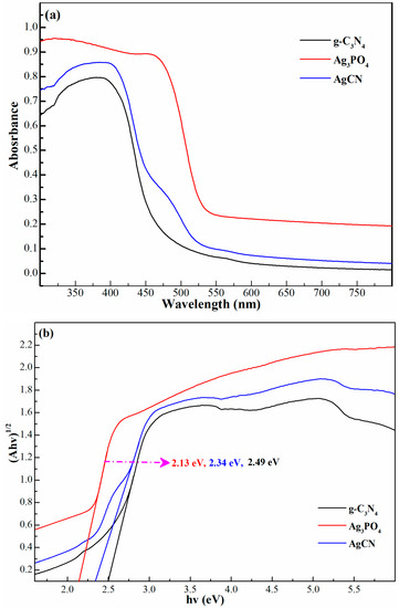 where α is the absorption coefficient, hv is the light frequency, Eg is the band gap energy, and n is equal to 1 or 4, depending on whether the transition is direct or indirect, respectively. The type of electron transition in g-C3N4 and Ag3PO4 are both direct transition between bands. According to Equation (1), Eg of the g-C3N4 and Ag3PO4 photocatalysts can be calculated by a plot of (Ahν)1/2 versus photon energy (hν), as shown in Figure 4b. The Eg value of g-C3N4, Ag3PO4, and AgCN photocatalysts are 2.49, 2.13, and 2.34 eV, respectively.