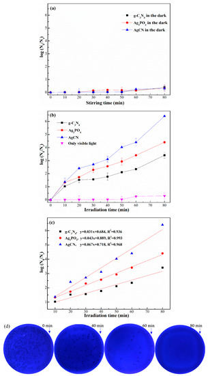 The inactivation activities towards representative bacteriophage f2 were investigated under visible light irradiation. Meanwhile, the inactivation efficiency in the dark and under visible light of the three catalysts (g-C3N4, Ag3PO4, and AgCN) were compared, as shown in Figure 6.