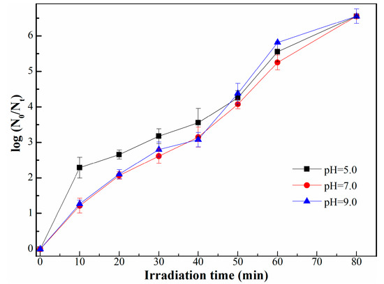 The disinfection efficiencies of as-prepared photocatalysts under a wide pH range from 5.0 to 9.0 were explored and the obtained results are displayed in Figure 7. In Figure 7, it is obvious that the removal efficiency of bacteriophage f2 reached 6.5 log within 80 min under the irradiation of visible light. The effect of pH on the efficiency of photocatalytic disinfection is not significant in the selected range from 5.0 to 9.0. Meanwhile, it is worth pointing out that, in the initial 40 min, the inactivation efficiency in acidic condition is higher than that in neutral or alkaline conditions, which may be due to the more hydroxyl radicals (·OH) generated under acidic condition. The strong oxidizing property of hydroxyl radicals promotes the photocatalytic disinfection, which is consistent with the results of other researchers [16].
