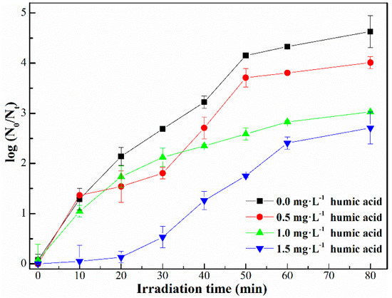Humic acid is one of the major natural organic matters and widely exists in natural water. According to the concentration range of humic acid in the actual water body, the effects of humic acid with different concentrations (0, 0.5, 1.0, and 1.5 mg·L−1) on photocatalytic disinfection by AgCN composite photocatalysts were investigated and the results are shown in Figure 8.