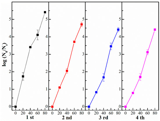 In Figure 9, it could be seen that, with the increase of reuse times, although the inactivation rate of bacteriophage f2 in water decreased to a certain extent, it remained around 4 log, which indicates excellent inactivation performance. In addition, during the experiments, it can be found that the AgCN composite after reaction still has good color and shape (faint yellow) compared with the single Ag3PO4 particles after reaction (brownish black). This means that the problem of easy oxidation of Ag3PO4 catalysts is effectively alleviated by combined AgCN composite, which is consistent with the literature [14,18,20]. Therefore, the AgCN photocatalysts have excellent stability of photocatalytic activity, which demonstrates that AgCN composite is stable visible-light photocatalyst and could be reused in inactivation of microbial contaminated water.