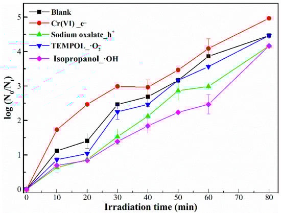 Active radical trapping experiments were designed to investigate thoroughly the main free radicals of photocatalytic inactivation. Photogenerated holes (h+), photogenerated electrons (e−), hydroxyl radicals (·OH), and superoxide ion radicals (·O2−) are often regarded as the reactive species in photocatalytic process. Therefore, in the experimental design, h+, e−, ·O2− and ·OH were trapped by 5 mM of sodium oxalate, potassium dichromate, 4-hydroxy-2,2,6,6-tetramethylpiperidin-1-oxyl (TEMPOL), and isopropanol, respectively. The experimental results are shown in Figure 10.