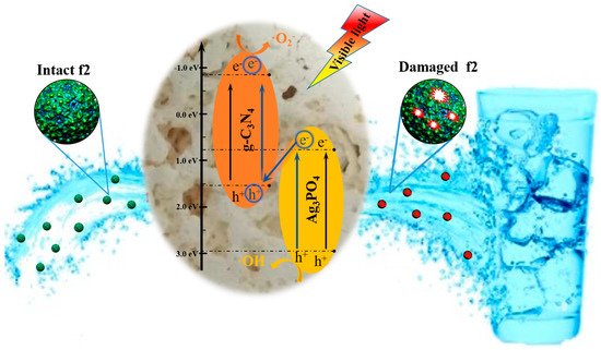 Both g-C3N4 and Ag3PO4 can be irradiated to generate electron–hole pairs under visible light irradiation, and the photoexcited electrons from the VB of g-C3N4 and Ag3PO4 can be easily transferred into the corresponding CB of g-C3N4 and Ag3PO4. Meanwhile, photoinduced electrons from the conduction band (CB) of Ag3PO4 would be easily transferred to the valence band (VB) of g-C3N4. Then, the electrons stored in CB of g-C3N4 are trapped by dissolved oxygen near the surface of g-C3N4 in water to form reactive superoxide radical ion (·O2−). In addition, the holes (h+) in the VB of Ag3PO4 could react with H2O or OH− near the surface of Ag3PO4 to form hydroxyl radicals (·OH). Then, the bacteriophage f2 are oxidized by these highly active ·OH radical species, photogenerated holes (h+), and superoxide radical (·O2−). As a result, the photogenerated electron–hole pairs of Ag3PO4 and g-C3N4 photocatalysts are spatially separated, which improves the corresponding photocatalytic oxidation ability.