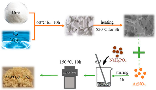 In this study, the Ag3PO4/g-C3N4 (AgCN) composite was synthesized via in-situ solvothermal method, as shown in Figure 12. In brief, 1.0 g of g-C3N4 powders, prepared by the means described in Section 3.2, was uniformly dispersed in the ultra-pure water of 50 mL by ultrasound with 0.3 kW. Then, 0.5 mmol of silver nitrate (AgNO3) was dissolved in 10 mL ultra-pure water to form a homogeneous solution and then dropped into the solution of g-C3N4 by stirring for 1 h. Then, the 10 mL 0.5 mol/L sodium dihydrogen phosphate (NaH2PO4) solution was injected into the above solutions at the speed of 5 mL/min by constant-flow pump and continuously stirred for 1 h at ambient temperature. Then, the homogeneous solution was poured into a Teflon® autoclave (Zhonghuan Lab Furnace Co., Ltd., Tianjin, China) with a total volume of 50 cm3, followed by the hydrothermal reaction at 150 °C for 10 h. The pale-yellow powder products were separated by filter pump with 0.22 µm filter membrane, washed alternately with ultra-pure water and ethanol three times, respectively, and then dried in a draught drying cabinet at 60 °C for another 10 h. The products were denoted as AgCN composite. In addition, the single Ag3PO4 photocatalysts were synthetized based on the above method without adding the g-C3N4.