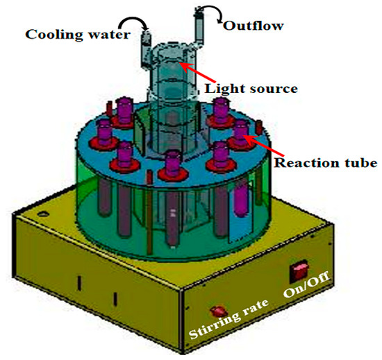 The photocatalytic disinfection experiments were carried out in a multisite photocatalytic reactor, as shown in Figure 13. The transparent reaction tube was a 100 mL glass tubes with certain optical properties. The cooling water system with a double-walled cooling-water hollow tube and Xenon lamp source were turned on sequentially, and the experiments were carried out until the light intensity and temperature of reaction stabilized. The source of visible light was provided by a CEL-HXUV300 Xenon lamp (Beijing ZhongJiaoJinYuan Tech Co. Ltd., Beijing, China) with a 400 nm cut-off filter, and the visible light intensity was adjusted to 30 mW·cm−2. The pH values of all solutions were adjusted with 0.1 M hydrochloric acid (HCl) and sodium hydroxide (NaOH) solution. To make the solution uniform, the reactive solutions were dispersed by magnetic stirring during the experiment. Moreover, the experimental results were obtained through three parallel experiments, and the corresponding error lines are accurately marked in figures.