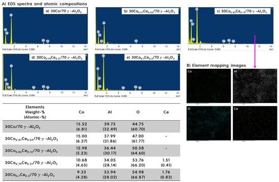 EDS spectra and atomic compositions (A) of all catalysts and mapping images for elements (B) present in the 30Co0.85Ce0.15/70γ-Al2O3 catalyst.