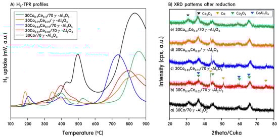 Many previous studies [29,30] have confirmed that the activities of catalysts containing reduced metals rather than metal oxides are better for hydrocarbon reforming. Therefore, reduced catalysts were used in this study, and H2-TPR measurements of all catalysts were performed to determine the appropriate reduction temperature. Figure 4A shows the H2-TPR profiles of the 30CoxCey/70γ-Al2O3 catalysts, where the peak area corresponds to the hydrogen uptake and the peak position corresponds to the reduction temperature of the catalyst species. In general, the reduction peak for pure Co3O4 to CoO is observed at about 250 °C, whereas the peak for CoO to Co metal occurs at about 400 °C [31]. From the XRD pattern shown in Figure 1, we confirmed that all the catalysts contained Co3O4 and CoAl2O4. Finally, the TPR profile for 30Co/70γ-Al2O3 shows a large peak at 850 °C, corresponding to the reduction of the stoichiometric cobalt aluminate species (spinel CoAl2O4) [32]. Two distinct peaks centered at 420 and 500 °C were observed, which are attributed to the two-step reduction of Co3O4 to CoO and then to Co, respectively, which interacts with the Al2O3 support [33]. However, in the catalysts substituted with Ce, Co partially escapes from the skeleton and is present outside the lattice as Co3O4. The reduction peak for this, i.e., the peak corresponding to the reduction of Co3O4 to CoO, was observed at about 200 °C. Furthermore, in the catalysts containing Ce, the reduction of Co3O4 and CoO occurs at lower temperatures, about 400 °C. In particular, the reduction of Co ions in CoAl2O4, which usually occurs at high temperatures, also shifted to a low temperature of about 700–800 °C. Thus, the addition of Ce into the framework lattice facilitates the removal of lattice oxygen, and thus, more Co is reduced. This means that the oxygen in the Co-O-Ce lattice is more easily removed than in the Co-O-Co lattice. On the other hand, in the 30Co0.7Ce0.3/70r-Al2O3 catalyst, which has the highest Ce substitution, a peak was observed in which Ce4+ was reduced to Ce3+ at about 550 °C (strictly speaking, this corresponds to the oxygen vacancy of cerium oxide). Finally, as the amount of added Ce increased, the peaks shifted to low temperature, suggesting that the reduction is affected by the synergistic effect of Co and Ce. Possibly, the increase in the strain induced by the addition of Ce improves the reduction of the catalyst by reducing the strength of the metal–oxygen bond [34]. Based on the TPR profiles, all the catalysts were pretreated with hydrogen at 700 °C before PSR, and the XRD patterns of the catalysts after reduction are shown in Figure 4B. Metallic Co was observed in the XRD patterns of the 30CoxCey/70γ-Al2O3 catalysts. However, the amount of metallic Co decreased with increasing Ce substitution, and many peaks corresponding to Co3O4 and CoAl2O4 remained. In addition, diffraction peaks corresponding to metallic Ce (reduced from cerium oxide) were not observed in any catalyst, but the peak at 32°, which arises from Ce2O3, was stronger only in the most substituted 30Co0.7Ce0.3/70r-Al2O3 catalyst.