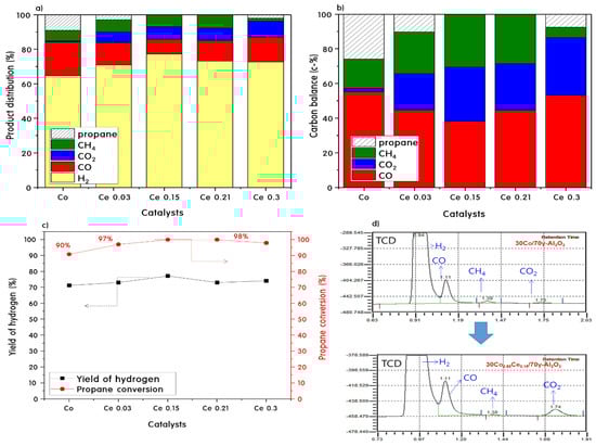 Product distributions (a,b) and hydrogen yield and propane conversion (c) during propane steam reforming reaction at 700 °C after 10 h and GC signals (d).