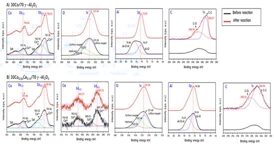XPS of the two representative catalysts, 30Co/70γ-Al2O3 (A) and 30Co.85Ce0.15/70γ-Al2O3 (B), before and after PSR.