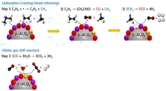 Based on the catalytic performance for the PSR and physicochemical characteristics, Scheme 1 presents a proposed PSR mechanism for the 30Co0.85Ce0.15/70γ-Al2O3 catalyst. During reforming, the Co or CoxOy components play important roles in the dehydrogenation and thermal cracking of propane gas, transforming the propane gases to C2H4 and CH4 as an intermediate and then acetaldehyde (CH3CHO), generated by ethylene oxidation over bimetallic CoCeO [48,49]. The acetaldehyde was thermally and catalytically cracked to CH4 and CO. The CH4 and CO obtained were accompanied by other reactions, such as the CH4-steam reforming reaction and CO-WGS reaction. Based on CO- and H2O-TPD experiments, water molecules were well adsorbed on cerium oxide components and CO molecules were well adsorbed on the bimetallic CoCeO components. Finally, the oxygen vacancies were filled because of the interaction with water vapor and oxygen donated sites in cerium oxide. Meanwhile, the CO-water gas shift reaction took place predominantly on CoCeO bimetallic oxide. Based on the excellent oxygen delivery properties of Ce, the vapor (H2O) participates in the WGS reaction on the cerium oxide surface produce H2 and CO2. In conclusion, cerium oxide, as a promoter, helps to produce a high hydrogen yield in the PSR reaction when using the 30Co0.85Ce0.15/70γ-Al2O3 catalyst.