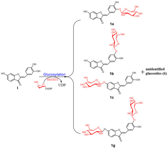 OcUGT1-catalyzed glucosylation of sulfuretin (1) resulted in the generation of ten glucosides (1a, 1b, 1c, 1g and six unidentified compounds).