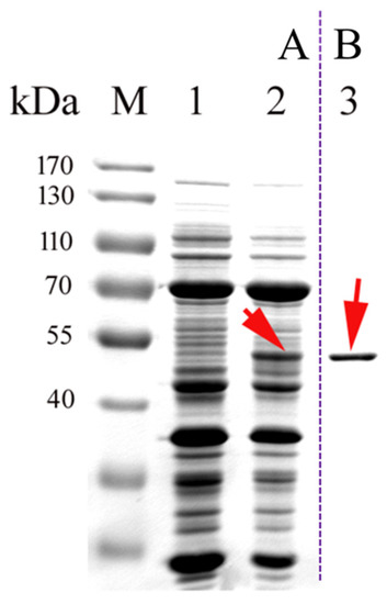 Heterologous expression (A) and affinity purification (B) of OcUGT1. 1, total protein of the control strain BL21(DE3) [pET-28a (+)+pKJE7]; 2, total protein of BL21(DE3) [pET28a-OcUGT1 + pKJE7]; and 3, the purified OcUGT1 protein. Values at the left margin indicate the position and molecular mass of protein standards. Red arrows show the recombinant OcUGT1.