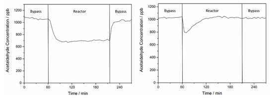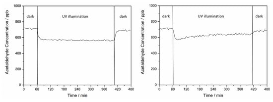 After the gaseous acetaldehyde treatment in the dark, the samples were illuminated by UV light, for 6 h, in the O2 and in the N2 atmosphere. The corresponding curves, showing the concentration of acetaldehyde as a function of time are displayed in Figure 8 in the presence (left) and in the absence of O2 (right). In both, the O2 and the N2 atmosphere, the concentration of acetaldehyde decreased from 700 ppb to 580 ppb, in the beginning, indicating a degradation of acetaldehyde by TiO2. In the presence of O2, the concentration remained at a constant low, during the UV illumination, thereby evincing a steady decomposition of acetaldehyde, in the O2 atmosphere. After 6 h of UV illumination, the lamp was turned off and the acetaldehyde concentration increased again. In the N2 atmosphere, a different trend was observed. While in the beginning, the concentration of acetaldehyde was as low as in the O2 atmosphere, it increased with increasing illumination time. When the UV lamp was turned off again, the concentration rose further.