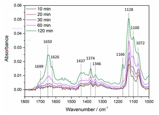 ATR-FTIR analysis of a TiO2 film treated with acetaldehyde was performed to figure out the reason behind the constant low amount of acetaldehyde detected at the reactor outlet, under dry conditions, in the dark. Figure 3 shows the FTIR spectra in the wavenumber range between 1000 cm−1 and 1800 cm−1, which were recorded during the gaseous purging of acetaldehyde over a TiO2 film, for two hours, in the dark. Different bands appeared and increased in intensity, during the acetaldehyde dosing. In Table 1, the positions of the bands are assigned to the specific molecular vibrations of acetaldehyde and crotonaldehyde. These band assignments were in accordance to literature, where an adsorption of acetaldehyde on TiO2 had also been reported by the FTIR spectroscopy [9,14,15]. The carbonyl group of acetaldehydes could form hydrogen bonds with the surface hydroxyl groups of the TiO2. It could be stabilized on the TiO2 surface, via an interaction between the oxygen lone pair, with the Lewis surface sites of TiO2 [14,16], the corresponding vibrational position was located at ν(C=O) 1699 cm−1. Additional characteristic bands of acetaldehyde, such as the ρ(CH3) and ν(C-C) were also detected and these can be seen in Table 1.