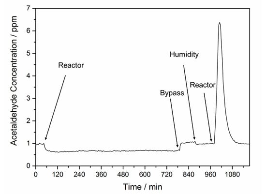 For a better understanding of the processes occurring under dry and humid conditions, the experiment shown in Figure 2 was repeated and a TiO2 film was treated with a gas flow of 1000 ppb of acetaldehyde, under dry conditions. A constant low amount of 700 ppb acetaldehyde was observed again (see Figure 5) evincing that acetaldehyde was adsorbed on the TiO2 surface where it reacted to the crotonaldehyde. Hence, crotonaldehyde and acetaldehyde were present on the surface. When the gas flow was changed to the bypass mode, the concentration of acetaldehyde increased to the initial value again. Water was subsequently added to a washing flask to generate a humidified gas flow that was directed over the anatase film again. The concentration of acetaldehyde increased drastically to 6 ppm (6000 ppb) indicating a favorable adsorption of water on the anatase surface which resulted in a desorption of acetaldehyde molecules from the surface. After 2 h, the concentration decreased again to the initial value of 1 ppm (1000 ppb). Hence, in the humid conditions, crotonaldehyde was not generated due to the minor adsorption of acetaldehyde molecules, which were not able to react with each other (see Figure 6).