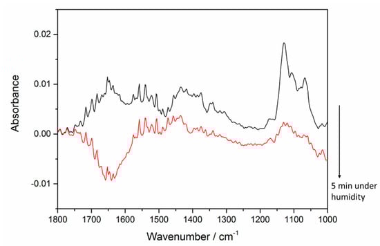 ATR-FTIR spectra recorded after purging an anatase film with acetaldehyde for 2 h, under dry conditions (black). In the presence of humidity, the band’s characteristics for acetaldehyde and crotonaldehyde decreased in intensity, within 5 min, indicating a desorption of both molecules (red).
