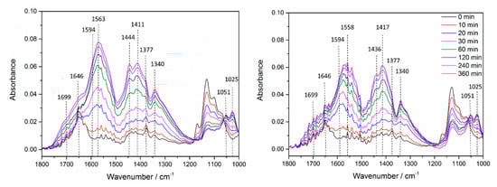 ATR-FTIR spectra of a TiO2 film recorded during gaseous treatment of acetaldehyde in O2 (left) and N2 (right) atmosphere, upon UV-illumination, for 6 h.